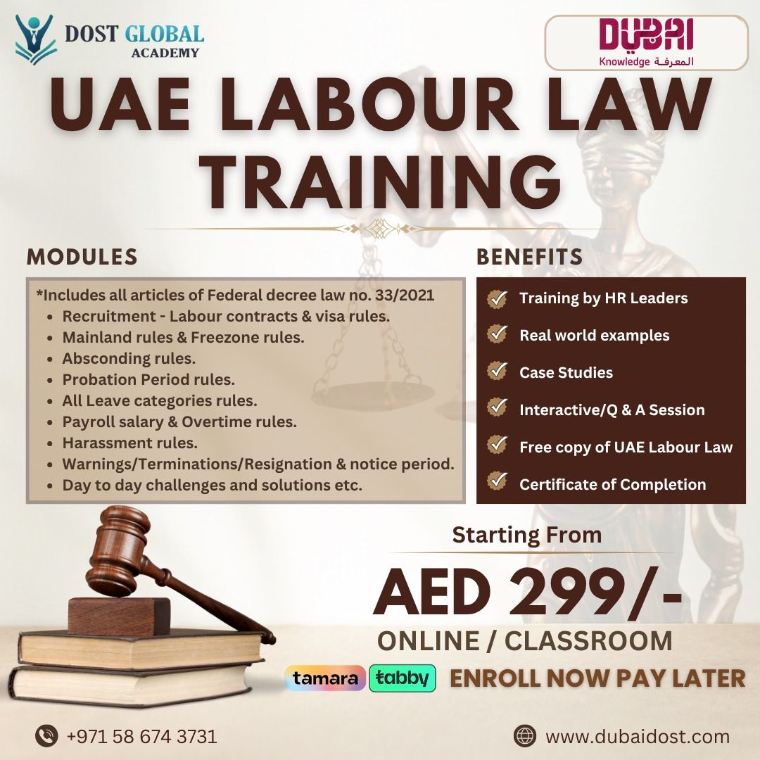 Dost Global Academy Madeena Zayed Building, AbudhabiKnow Employee Rights & Employment rules in UAE Original price : AED 1000 Special offer: AED 299 Every Saturday/Sunday Duration : One day session (5 hrs) Classroom and Online Live All key articles & topics of New UAE Labour Law (Federal decree law 33 of 2021) will be covered. Training includes: β Employment & Labour contract